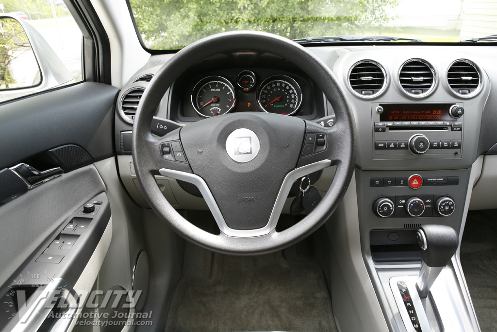 Gauges consist of an 8,000 RPM tachometer and 120-MPH speedometer, with a smaller fuel gauge in between. The driver information display shows the odometer, outside temperature, compass direction, and the transmission mode. A charge/boost gauge (and an "ECO" light on the instrument panel) indicates battery and electric motor assist status. Surprisingly, Saturn neglected to include a coolant temperature gauge. Audio and cruise control buttons are conveniently mounted on the steering wheel. Knobs for the HVAC settings are located on the center stack below the audio system controls.