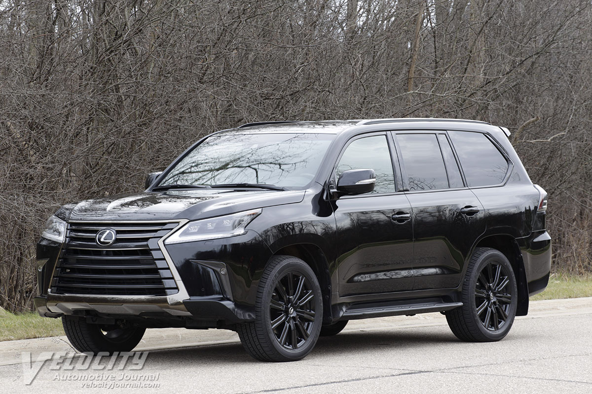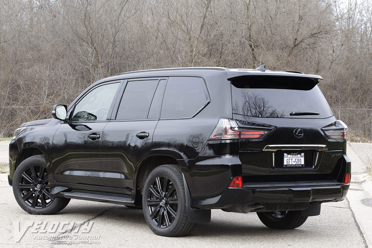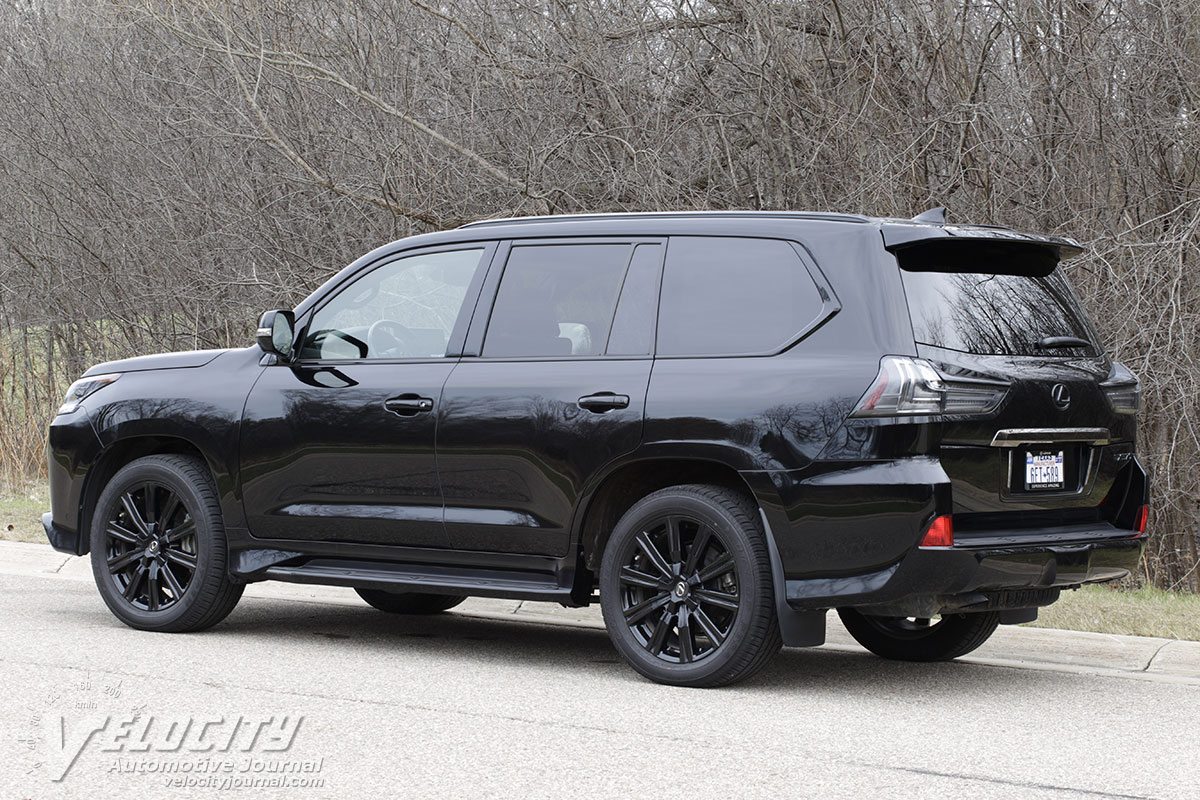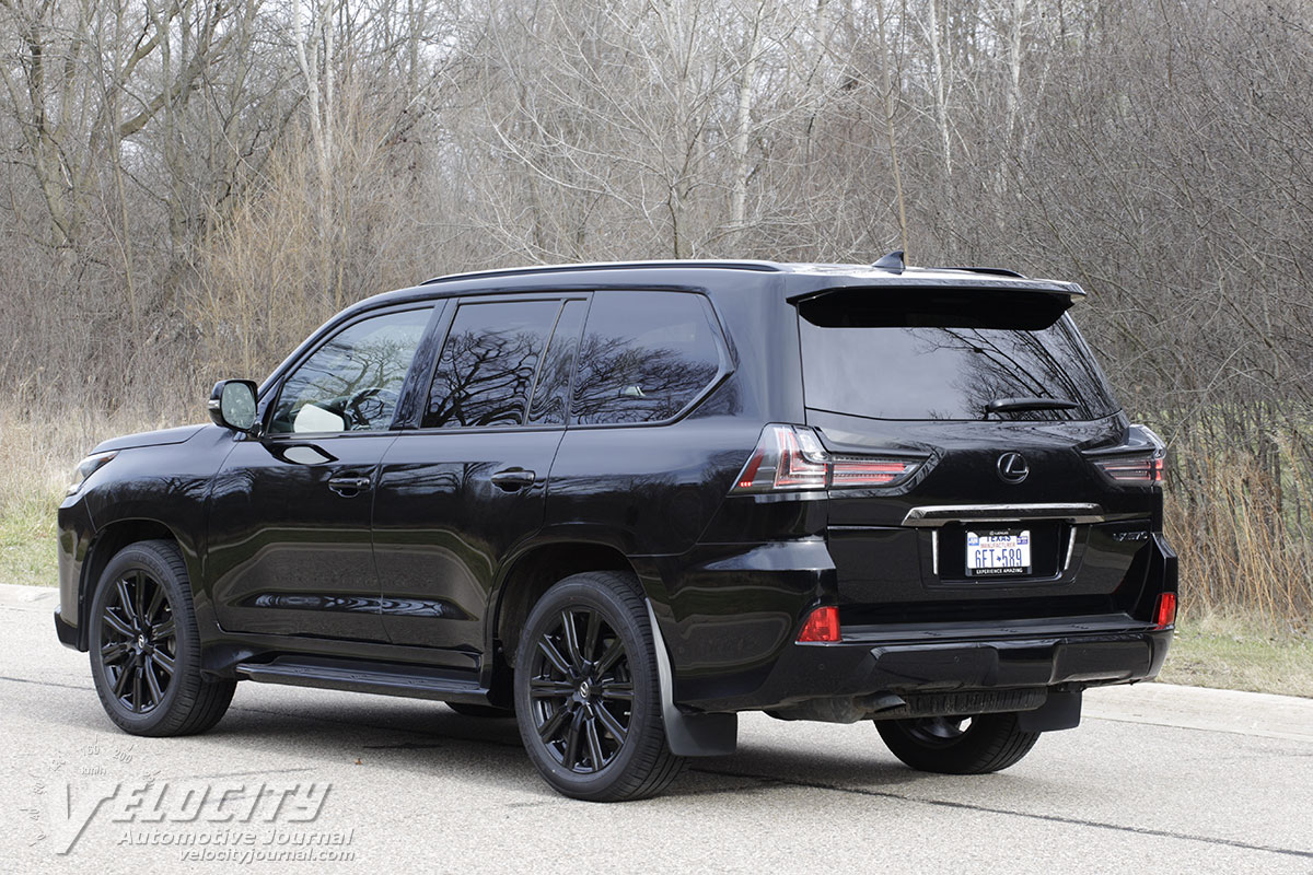 The LX front suspension consists of double wishbones, coil spring and dampers. At the rear is a solid axle suspended with coil springs and dampers; four links and a lateral rod locate the rear axle. An electrohydraulic system adjusts suspension height and load levels automatically. Steering is via a hydraulically-assisted variable-ratio rack-and-pinion system. Brakes are vented discs at all four wheels: 13.9-in. dia. rotors (front) and 13.6-in. dia. (rear). The standard wheel/tire package is 20-in. dia. alloy wheels and 285-50R20 all-season tires. Our test vehicle was equipped with the optional 21-in. dia. alloy wheels and 275/50R21 Dunlop Grandtrek PT34 all-season tires. Curb weight is a substantial 5,800 lbs.