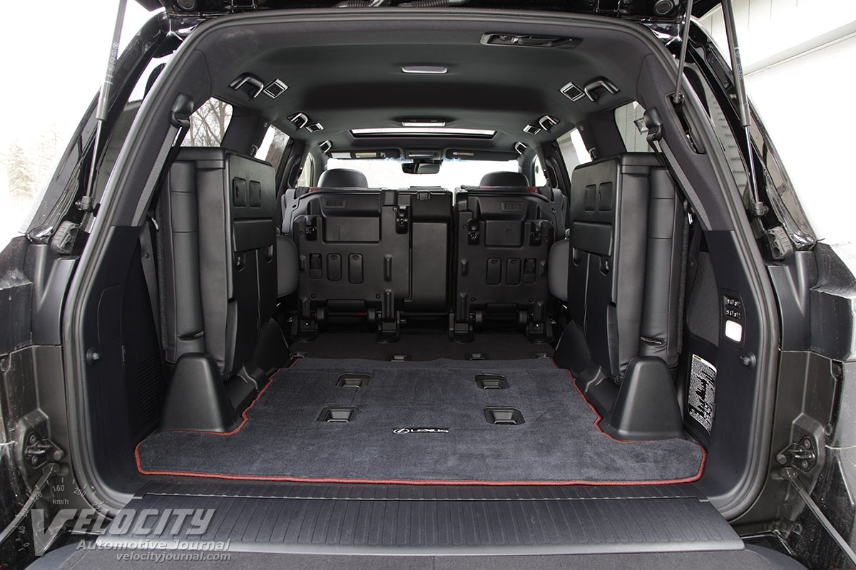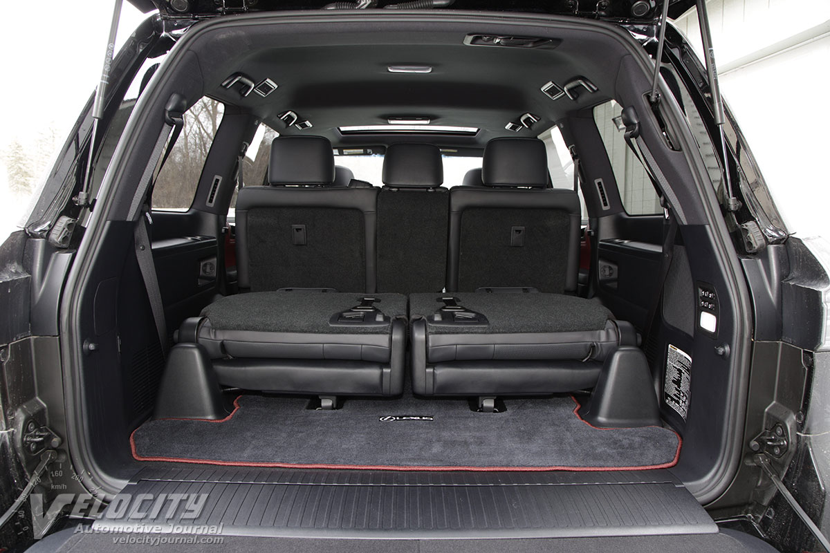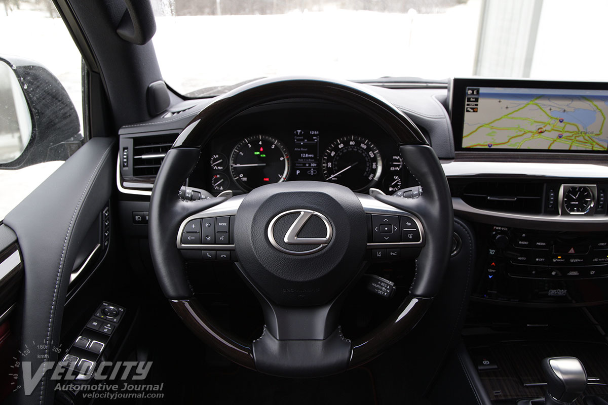Under the hood is a 5.7L V-8 rated at 383-hp @ 5,600 RPM and 403 lb.-ft. @ 3,600 RPM. The 3UR-FE V-8 features dual overhead-cams and variable valve-timing. Coupled to the V-8 is an 8-speed automatic coupled to 3.301:1 axle ratio. The 2-speed 4WD transfer case has a 2.618:1 low gear ratio. A TORSEN(R) limited-slip center differential splits torque between the front and rear axles in the full-time 4WD system. Lexus estimates fuel consumption at 12/16 MPG (city/hwy.). We averaged 14 MPG in mixed city and highway driving.