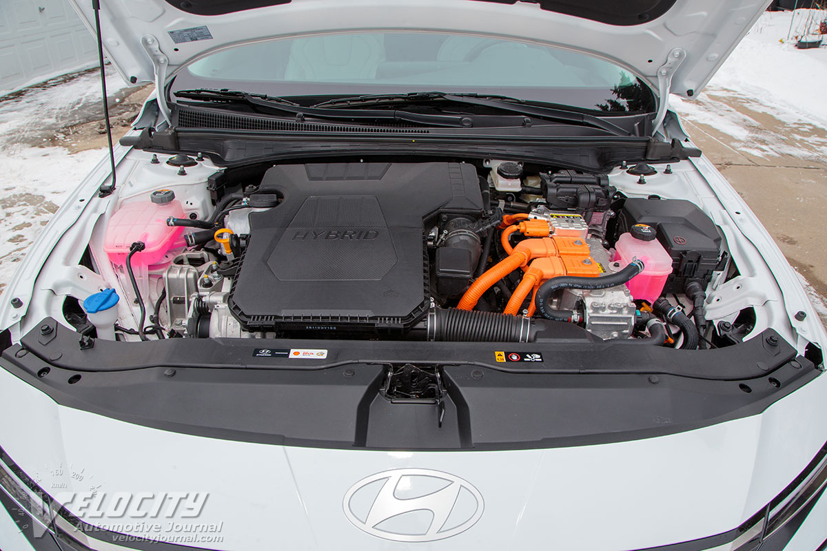 An all-aluminum DOHC 1.6L or 2.0L inline-4 powers all Elantras. SE, SEL Sport and Limited models get an Atkinson-cycle 147-hp 2.0L. A 201-hp turbo 1.6L powers the Elantra N Line, and the hot Elantra N gets a 276-hp turbo 2.0L. Hybrid Elantras have a direct-injected Atkinson-cycle 1.6L inline-4 developing 104-hp @ 5,700 RPM and 109 lb.-ft. @ 4,000 RPM. A 1.32 kWh lithium-ion battery pack powers a 240V permanent-magnet synchronous AC motor rated at 32 kW (43 hp) and 125 lb.-ft. of torque. Total system power and torque is 139-hp and 195 lb.-ft., respectively. A 6-speed dual-clutch transmission (DCT) sends power to the front wheels. EPA fuel economy estimates are 49/52 MPG (city/hwy.). We averaged an unimpressive 33-34 MPG in mixed urban and highway driving, although the chilly winter temperatures during our test significantly reduced hybrid system efficiency.