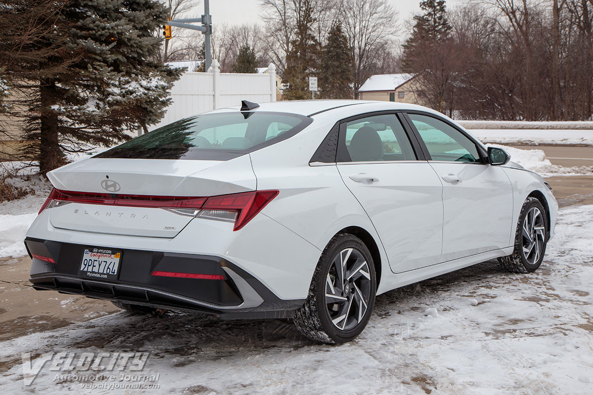All Elantras share a MacPherson front suspension coupled to a stabilizer bar. At the rear is a multi-link independent setup with coil springs, dampers and stabilizer bar (Hybrid, N Line and N). Other Elantras get a semi-independent torsion beam axle. Hybrid Elantras are equipped with 17-in. alloy wheels and 225/45R17 Hankook Kinergy GT all-season tires. Brakes are discs at all four wheels: 11.0-in. vented rotors (front) and 10.3-in. solid rotors (rear). A motor-assisted rack-and-pinion steering system is geared for 2.5 turns lock-to-lock. The Elantra Hybrid's curb weight is a relatively heavy 3,069 lbs. due to the hybrid powertrain and battery pack.